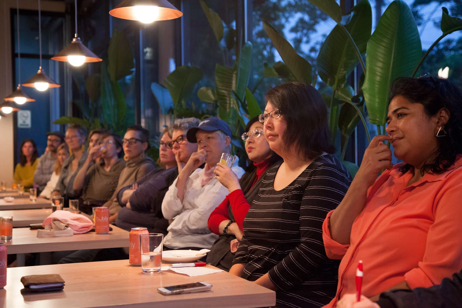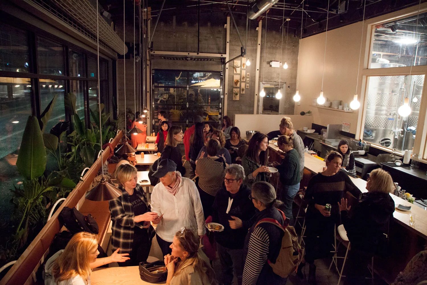 It was against this backdrop, (with sample-sized cocktails, too!) that those who came to the Lady Makers meetup on October 8 were introduced to Kate Day and Sara DeLuca of Dovetail Workwear (with cofounder Kyle Marie there in spirit), who in turn asked the group to introduce themselves and what brought them there. Nearly forty in attendance, this took a while, and the sheer talent and diversity of the group was made evident; jewelry, clothing, furniture, and cocktail mixers were among the businesses the lady makers listed.