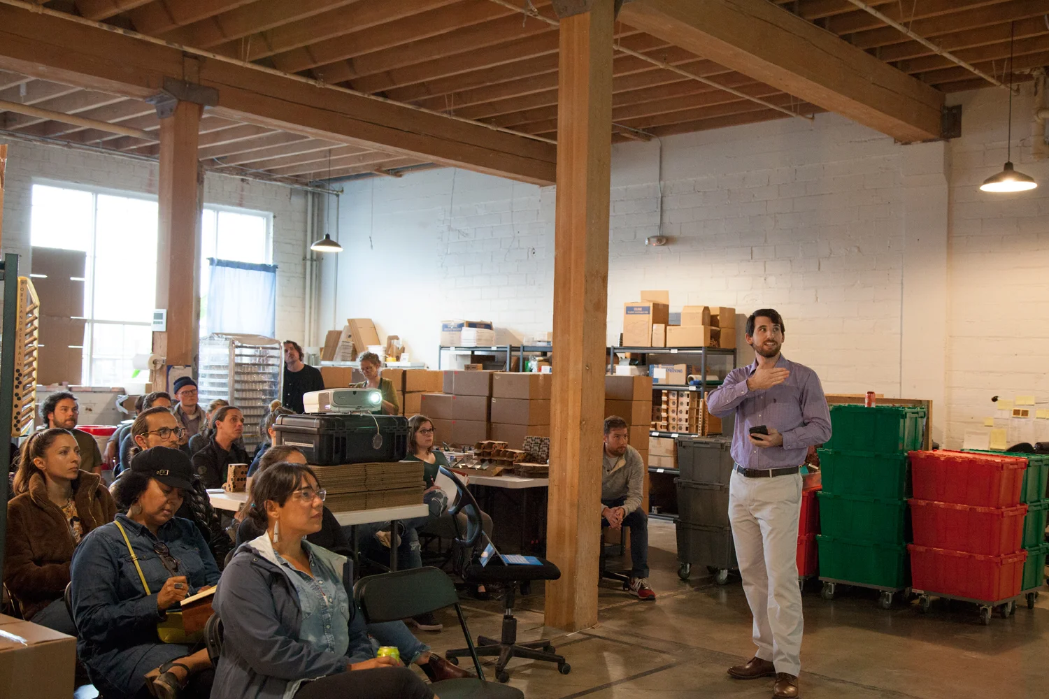 On June 27, makers gathered at Portland Bee Balm to revisit the topic of scaling up, this time with a more technical focus. They were greeted by the aroma of beeswax, the taste of some of Portland's best local food and beverage offerings (Reverend Nat's ciders, Olympia Provisions charcuterie), and the visual of a buzzing production facility. Storage tubs filled with beeswax were neatly placed along one wall, packaging supplies on the other side of the space, and pallets of other materials lined the back wall.